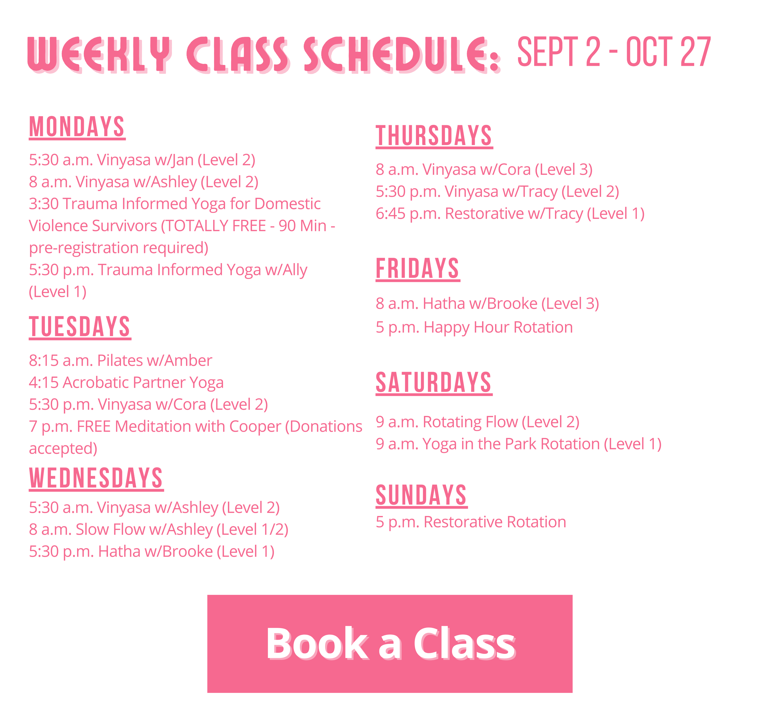 Whether you are dropping in or have a membership, booking online in advance ensures the class will run and makes the check-in process much easier for our instructors. If any class has less than 2 people registered in advance, instructors have the option to cancel that class.